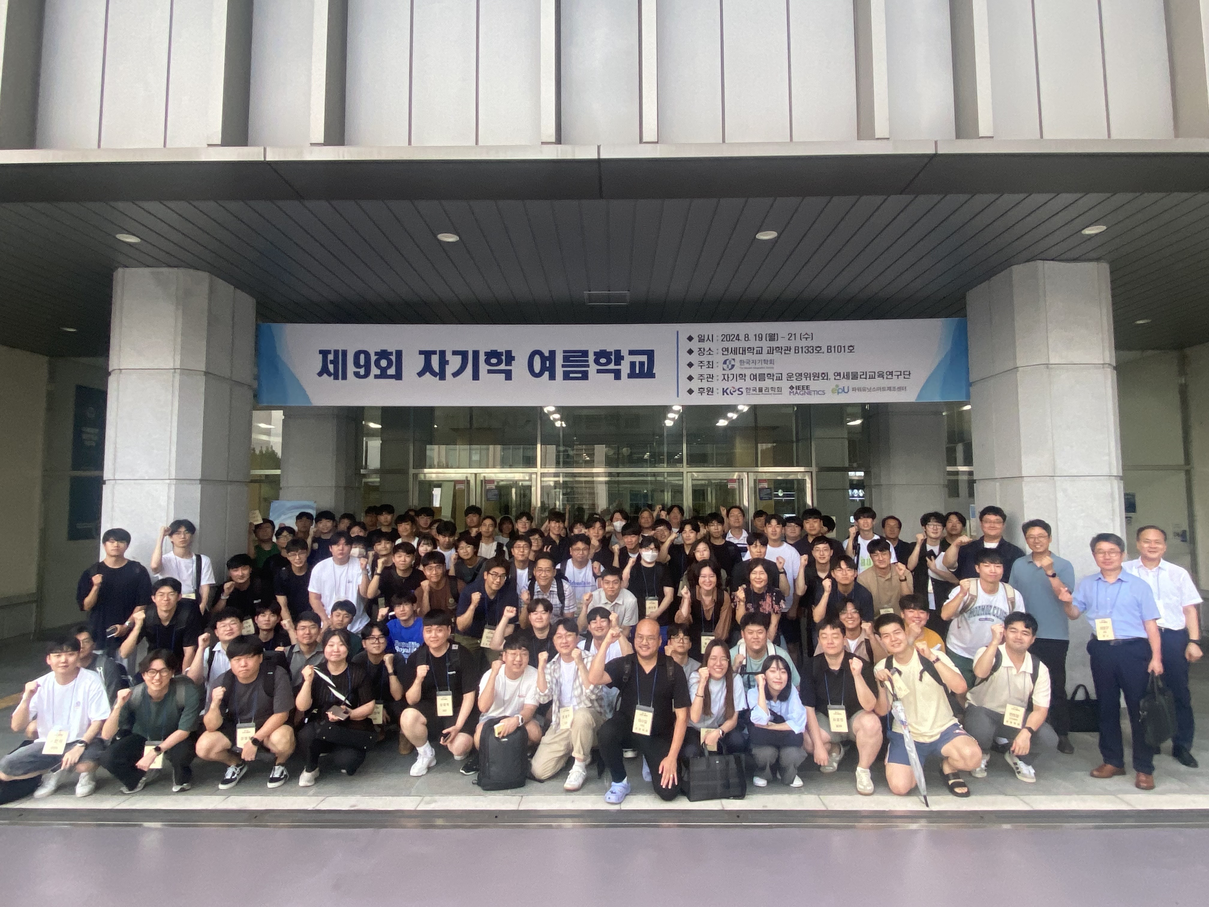 <제9회 자기학 여름학교 참가자 단체사진> 한국자기학회에서 주관하는 2024년 제9회 자기학 여름학교(교장 임혜인 교수, 숙명여자대학교)는 8월 19일에서 21일, 연세대학교 과학관에서 진행되었습니다. 이번 여름학교에는 총 223명이 참가하였으며, 한국자기학회, IEEE Magnetics Society, 한국재료연구원 파워유닛스마트제조센터로부터 후원을 받았습니다.