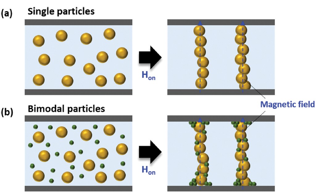 자기 유변 유체는 외부 자기장이 인가되면 액체 상태에서 반고체 상태로 가역적인 전이가 일어나는 스마트 재료이다. 이러한 거동은 유체 내에 분산되어 있는 연자성 입자들이 자기장의 방향에 따라 정렬되어 사슬 형태의 미세 구조를 형성하는 데서 비롯된다. 사슬 형태로 정렬되는 미세구조의 변화는 항복응력, 점도, 저장 탄성률 등 유변학적으로 민감한 반응을 변화시키게 된다. 본 연구에서는 대표적인 연자성 입자로 알려진 carbonyl iron particles(CIPs)을 활용하여 multi-modal 방법 기반의 자기 유변 유체를 제조 및 그 특성을 분석하였다. 단일 크기의 CIP 분말로 제조된 자기 유변 유체에 비해, multi-modal 방법 기반의 자기 유변 유체는 단단한 자기 사슬 구조를 제공함으로써, 높은 항복 응력 및 점도 특성을 보유함을 증명하였다. 본 연구는 고특성의 자기 유변 유체 제조에 중요한 지침이 될 수 있으며, 특히 자기 유변 유체를 활용하는 진동 제어 부품 응용에 기여할 수 있다.